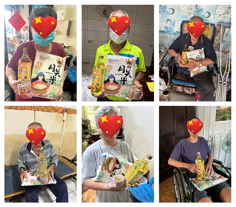 • 照片說明文字感謝善心人士捐贈善款購買米2KG ×250包、葵花油1L ×252罐、土豆麵筋170g×288罐,捐助社團法人臺東縣向日葵關懷協會協助弱勢家庭。